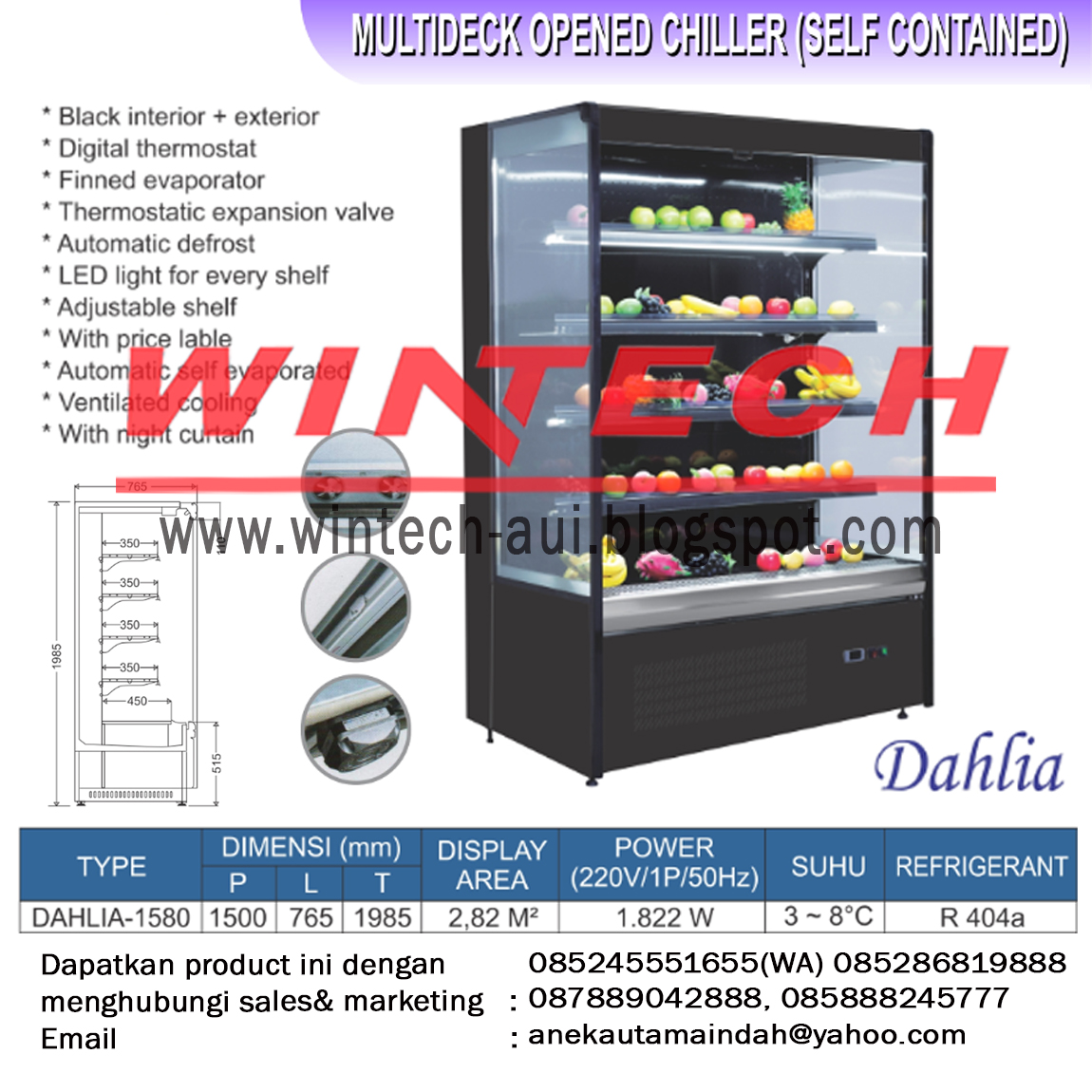 WINTECH menjual Multideck Opened Chiller yang befungsi sebagai pemajang buah, sayur, dll. Cocok digunakan di supermarket, minimarket, toko daging, dll. Kami menjual beberapa type Multideck Opened Chiller, yakni :
